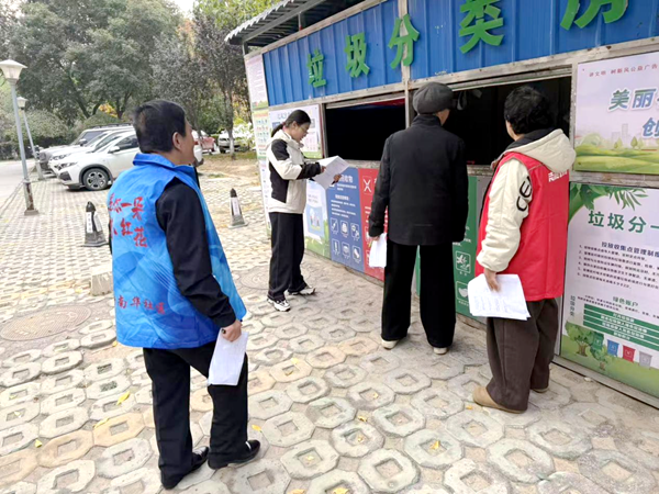 查完消防,一行人又往小区西北角的垃圾分类房赶。微风卷着几片掉落的杨树叶飘在脚边,刚走近就闻到一股淡淡的消毒水味——“比上次来清爽多了。”张阿姨先绕着分类房转了圈,指着墙面说:“上次来这儿还沾着不少厨余油渍,现在擦得亮堂堂的,不错!”小田打开垃圾分类房的投放口,没发现散落的垃圾,又观察厨余垃圾桶里面的垃圾既没溢出来,也没明显异味。
