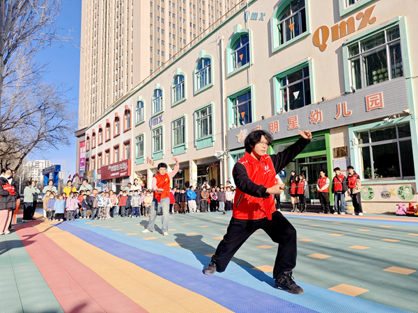 12月2日下午,天盛社区团支部联合宁夏医科‌大学青年志愿者通过太极剑、八段锦、健康知识小课堂等方式向辖区启明星幼儿园师生普及冬季传染病预防知识‌及如何有效增强抵抗力,此次活动共有140余名师生参与。