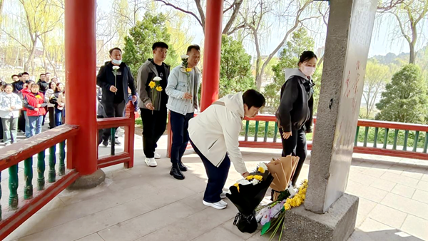 “碑前忆英雄,湖柳摇春钟。联袂亭前祭,先驱万古崇。”这句饱含深情的诗句,是银川市市政工程管理处工作人员单生平同志在活动现场发出的感慨,诗句意境与眼前景象交相辉映,微风拂过湖面,柳丝轻摇,仿佛在与先辈对话、向英烈致敬。全体参与人员怀着无比崇敬的心情肃立碑前,追忆革命先烈为民族独立、人民解放做出的不朽牺牲。活动伊始,主持人以春日寄思为引,串联起清明追思与英烈精神,引导大家在肃穆的氛围中感悟初心、传承使命。随后,银川市市政工程管理处代表、自强社区代表率先向烈士纪念碑敬献花束,全体人员依次缓步上前,手持鲜花轻轻摆放于碑前,每一朵鲜花都承载着对英烈的深切缅怀,每一个鞠躬都饱含着对先辈的崇高敬意。