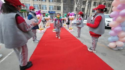 早上七点半,记者在兴庆区第十八小学景湖校区看到,老师们早早地来到校门口等候,有的还穿着兔子造型的人偶服,迎接“小神兽们”的归来。同时,现场还有走红毯、跨标语、击鼓鸣志等仪式感满满的“入园礼”,让大家自信满满地走进校园。