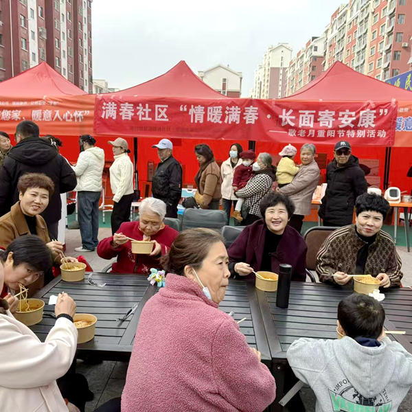 10月29日一早,满春宜居苑广场便热闹起来。活动条幅随风轻扬,音响里循环着《九月九的酒》,近百名辖区老人热热闹闹地走来,张奶奶牵着老姐妹的手,慢慢挪到休息区;李爷爷由孙子推着轮椅,眼神里满是期待;还有不少老人带着小竹凳,找个向阳的位置坐下,等着这场以“长面”为名的重阳之约。