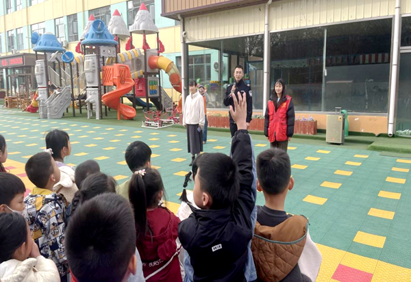 “呜——呜——”急促的消防警报声突然划破雨丝幼儿园院内的宁静,孩子们立刻捂住口鼻,在老师的带领下弯腰前行,沿着园内安全通道快步走向操场空地。11月11日上午,中山南街康华社区工作人员与辖区派出所民警一同来到雨丝幼儿园,联合开展的消防演练在这场“突发火情”中拉开序幕。