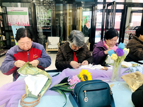 制作环节,老师分步演示了面料裁剪、针法运用、配件组装等技巧,助教与社区工作人员巡回指导,耐心帮扶动手能力较弱的老人。老人们专注投入,穿针引线间,原本普通的面料逐渐变成了带有刺绣、盘扣等元素的精美包包。大家还发挥创意,搭配流苏、玉石挂件等配件,融入个性化设计,让每一件作品都独具匠心。