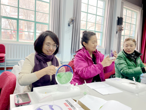 实践环节中,居民们手持沙画灯盘,小心翼翼地将彩色流沙注入容器。邢少寒阿姨手一抖,细沙洒落在桌面上,邻座的高丽大姐立刻伸手扶住容器,轻声安慰:“别急,我帮你。”两人默契配合,重新注入流沙,成功封住四周后反扣灯盘。随着流沙缓缓流动、沉淀,一幅渐变色的“星空图”逐渐显现,引得周围居民纷纷赞叹。