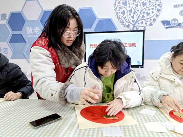 制作环节中,工作人员和志愿者们悉心指导。他们耐心协助每位参与者,轻声鼓励初次尝试的居民,手把手示范贴箔技巧。“这片金箔要慢慢贴,慢慢撕,对就是这样,做得真好!”温柔的话语让首次参加活动的谢阿姨放下了紧张情绪。谢阿姨表示:“原来担心自己做不好,但老师们特别耐心,让我觉得自己也能创作出漂亮的作品。”