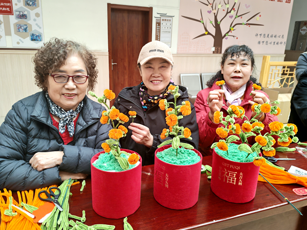“这扭扭棒做的柿子真喜庆,我要把它送给对门的王阿姨,也算是我们新时代的‘邻里相礼’啦!”12月29日,一位居民举着自己刚做好的福桶花,笑得合不拢嘴。