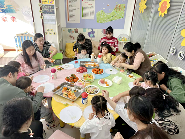 活动现场,孩子们在老师的带领下,时而追逐着漫天飞舞的泡泡,在滑梯和海洋球池里释放活力;时而围坐成圈,与家长一同体验水果拓印的乐趣,小小的手掌蘸取颜料,在纸上印出一片片金黄的“树叶”,亲子合作的画面格外暖心。桌上摆满了新鲜的水果拼盘,既是活动的材料,也是孩子们分享的甜蜜“战利品”,空气中弥漫着果香与欢声笑语。