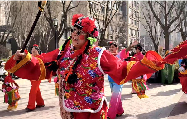 锣鼓声起,秧歌队踩着欢快的节奏入场。彩扇翻飞间,几位“特别演员”格外吸睛——独具民俗特色的“丑婆婆”、欢脱闹腾的“小毛驴”。喜庆的装扮、诙谐的表演,让围观居民忍俊不禁。笑声中,社区志愿者穿梭其间,把节日饮食安全的“干货”送到大家手中。热闹的社火,就这样成了流动的宣传站。