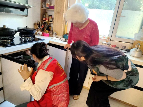 “袁爷爷,中秋节快乐!这是社区给您准备的月饼和水果。”在92岁独居老人袁建国中,社区网格员贺锦月、退役专干王雪将慰问品递到老人手中,并仔细检查了厨房燃气设备。当发现燃气报警器位置偏高时,工作人员立即调整至距地面30厘米的标准高度,同时为老人演示了自闭阀的正确使用方法:“这个红色按钮是紧急切断装置,遇到漏气会自动关闭,您每天做完饭记得顺时针拧紧阀门。”
