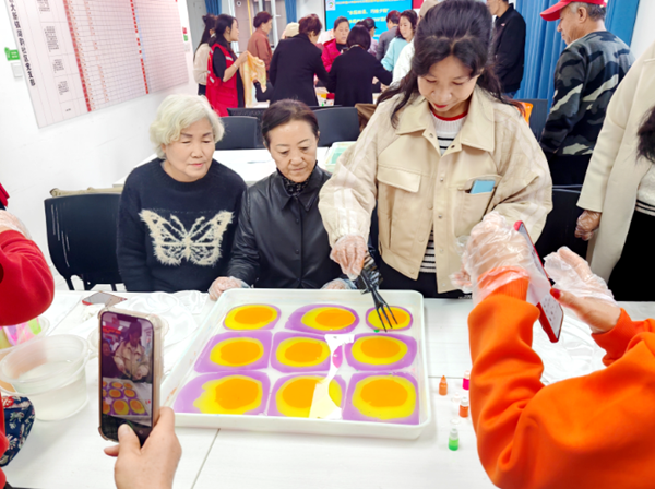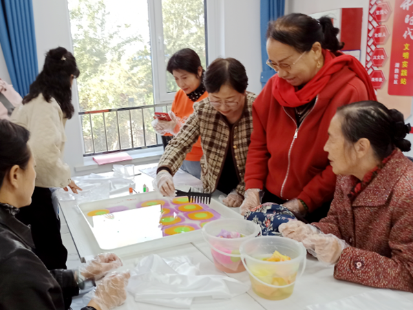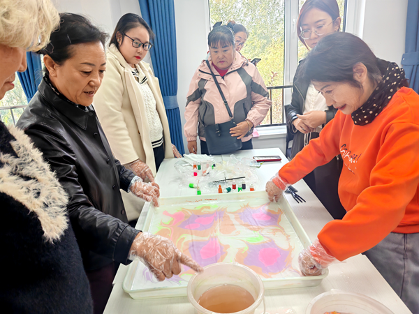 创作环节,老人们化身“艺术家”,在老师的指导下,先将颜料滴入水中,待色彩自然晕开后,用针笔轻轻勾勒出牡丹、菊花、山水等图案,再将丝巾平铺水面,短短几秒,水中的美景便完整“拓印”到丝巾上。75岁的李阿姨举着自己的“作品”笑得合不拢嘴:“退休后总觉得生活少点乐趣,今天不仅学会了新技能,还认识了好几位老邻居,以后社区再有活动,我肯定第一个报名!”现场不仅有技艺切磋,更有暖心互动,老人们互相分享生活趣事,主动帮忙整理工具,原本略显冷清的活动中心,变成了充满欢声笑语的“老年乐园”。