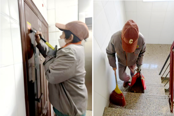 行动现场,社区网格员联合物业公司保洁人员有序开展楼道清扫保洁,逐层逐阶清拖地面,细致擦拭扶手,全面清理堆积杂物,让楼道环境清爽整洁;针对各类顽固小广告,保洁人员先集中铲除易清理点位,对胶痕牢固、难以铲除的,物业保安主动接力,用吹风机加热软化后逐一撕除,耐心清理每一处顽固污渍,全力扫清楼道“牛皮癣”。工作人员分工协作、精准发力,稳步推进整治工作,让居民楼楼道环境显著提升,墙面干净整洁,地面清爽无杂,居住质感大幅提升。