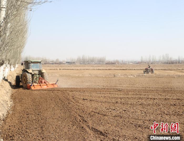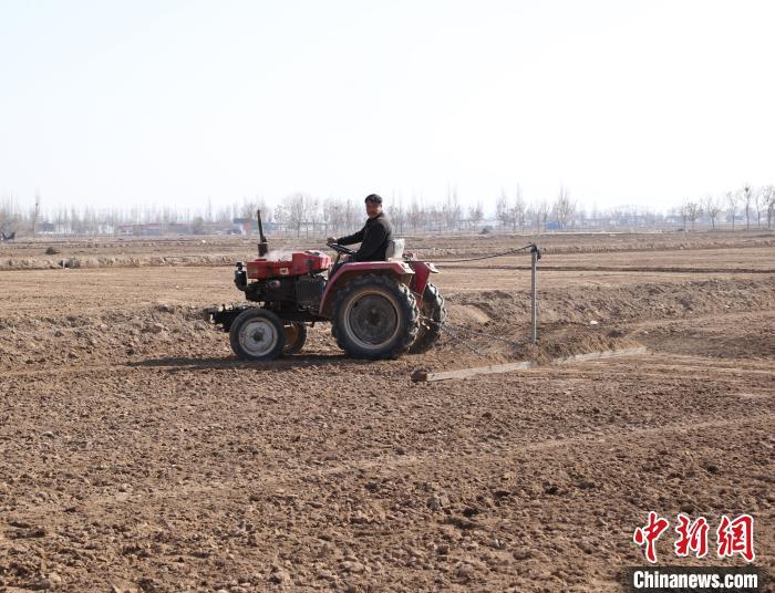 3月6日,银川市兴庆区通南村,农民开着农用车在田间平整土地。中新社记者 于晶 摄