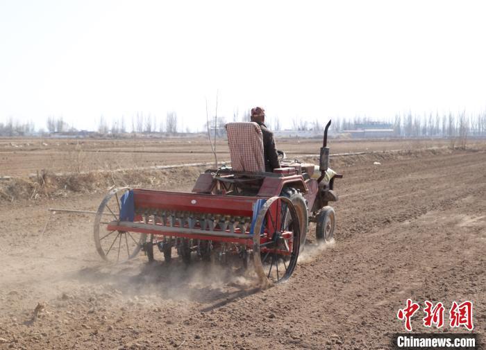 3月6日,银川市兴庆区通南村,农民开着农用车在田间施肥。中新社记者 于晶 摄