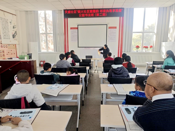 为让文化惠民真正走进群众生活,天盛社区精准对接居民需求,针对零基础群体量身打造楷书公益课程,通过网格群精准宣传、电话定向邀约、入户宣传等多渠道招募学员,特邀天盛书画院经验丰富的林宝森老师全程授课,庞玉红、石彦忠老师协助教学。从首期筹备到二期接续,社区始终贴心提供免费笔墨纸砚及临摹册,从硬件上为居民扫清入门障碍,让大家“空手而来,满载而归”,真正实现“零门槛学书法”。