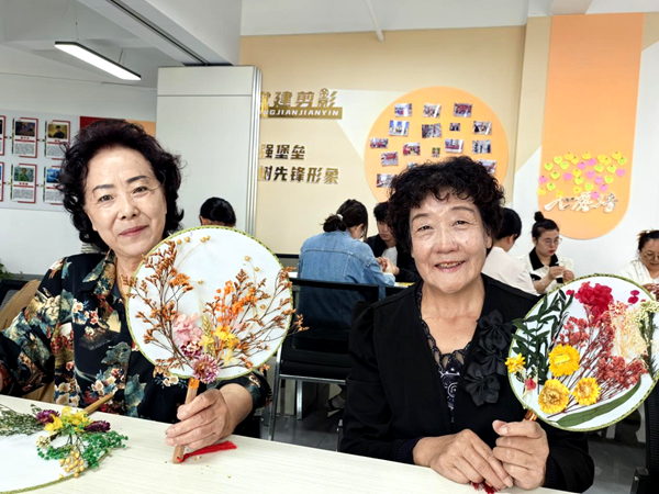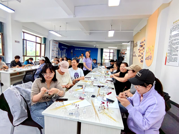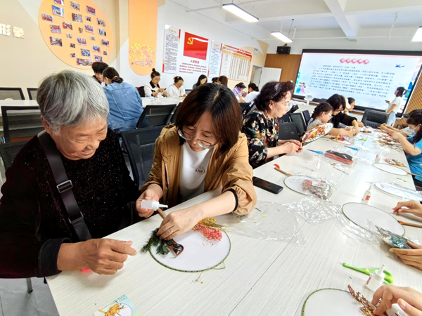 最受大家欢迎的当属创意手工体验环节。现场设置干花团扇DIY与不凋谢玫瑰花束制作两大区域,社区提前准备好空白团扇、干燥花材、永生玫瑰、环保胶水、包装丝带等材料包,并有工作人员全程指导。“您可以先把花材在扇面上摆好造型,确定位置后再涂胶水,这样更整齐。”工作人员耐心向居民讲解制作技巧。大家发挥创意,有的用玫瑰、薰衣草打造浪漫风团扇,有的以雏菊、满天星设计清新款花束,居民李叔拿着亲手制作的玫瑰花束笑着说:“第一次做这种手工,打算带回家送给老伴,让她也感受下节日的仪式感。”