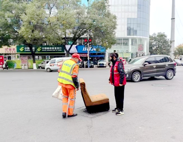 “先挡上,别让路人掉进去!”网格员小李的声音急促而坚定。几分钟前,她在日常巡查中发现井盖边缘破损,存在安全隐患。小李一边联系环保人员,一边从附近居民家中借来这张沙发,迅速完成了临时防护。从发现隐患到完成防护,全程不到10分钟。这张沙发,不仅挡住了可能的危险,更彰显了城市的温度与速度,让文明在细节中生根发芽。
