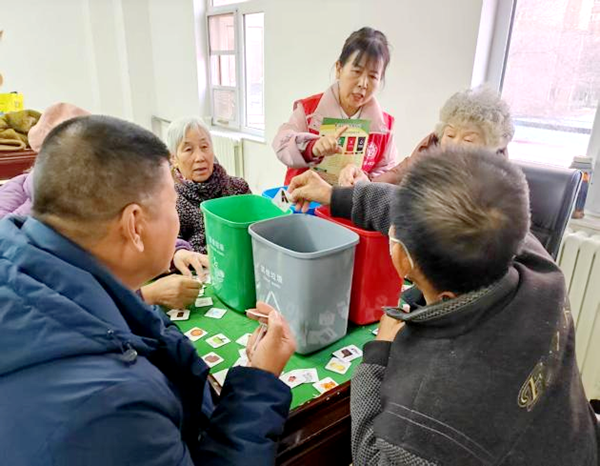 知识宣讲后,趣味互动游戏将氛围推向高潮。社区设置模拟垃圾投放适老化游戏,工作人员准备色彩鲜明、图文并茂的废纸、菜叶、废电池等日常物品模拟卡片,老人们分组合作,有序将“垃圾”精准投入对应分类桶,工作人员实时指导、纠正误区。现场笑声与加油声此起彼伏,老人们在轻松愉悦的氛围中巩固了分类知识。