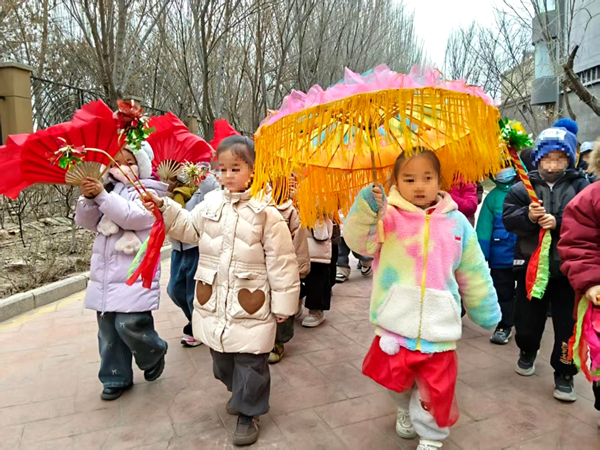 12月31日,胜利街清苑社区清苑尚景小区的广场与步道上锣鼓喧天,由社区联合银川市兴庆区第二十幼儿园的“小秧歌队员”成为绝对主角。小朋友身着亮丽的彩衣,头戴喜庆的头饰,敲锣打鼓,摇着彩扇,撑着花伞,扮成憨态可掬的小驴子,踩着鼓点扭着秧歌。清脆的童音与铿锵的锣鼓声交织,瞬间点燃了节日的气氛。
