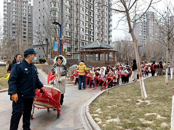 这支生机勃勃的队伍从广场出发,宛若流动的彩虹般沿小区步道缓缓前行。孩子们边走边演,虽然步伐稚嫩,但一招一式有模有样,红扑扑的脸蛋上洋溢着无比的欢快和兴奋。精彩的表演引得居民们纷纷驻足并举起手机记录,掌声、笑声汇成了最温暖的新年乐章。现场热烈的气氛感染了许多居民纷纷加入其中,他们有的敲锣,有的打鼓,还有的跟着队伍一起扭了起来,就连旁边的“观众”也跟着节奏点头,欢笑声此起彼伏。“仿佛回到了儿时过年的时候!”居民李阿姨举着手机边拍摄边说。物业的王大哥边帮忙拉着大鼓前行边笑道:“没想到效果这么好,传统文化把大家的心扭到一块儿了。”