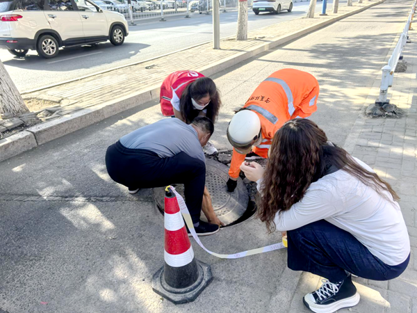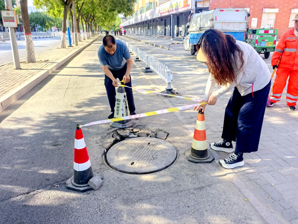 “先拉警戒线警示,再清理周边杂物,同时赶紧找责任单位!”史璐立刻行动,一边和同事用警示锥和警戒线将破损井盖区域围起,醒目提示过往行人车辆绕行;一边联系社区环卫部门,联合清理井盖周边的碎石、垃圾,让现场环境先规整起来。