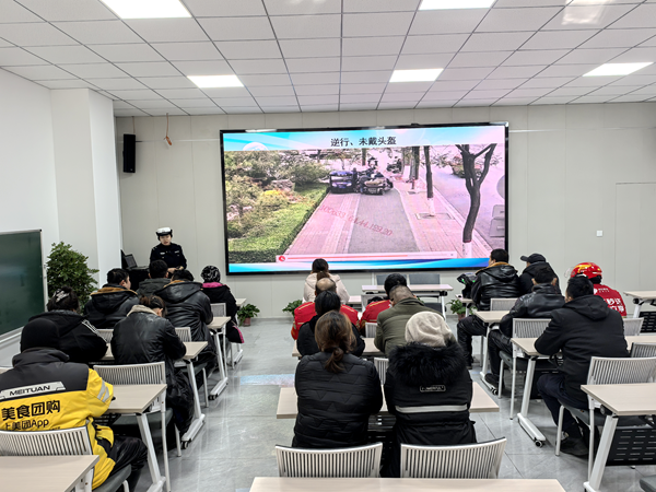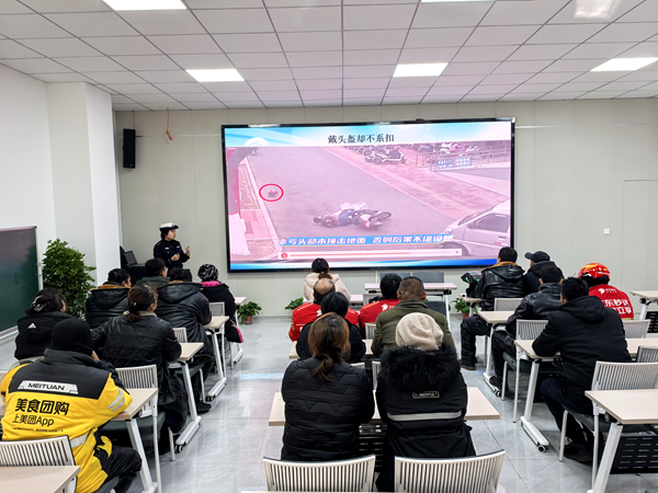 此次讲座特邀兴庆区交警一大队民警担任主讲人。采用“案例+数据”相结合的方式展开讲解。通过播放近期发生在周边区域、涉及外卖骑手的交通事故监控视频,民警深入剖析了事故背后的主要成因——多数因抢时间、闯红灯、逆行、在拥堵路段随意变道等行为引发。“像新华街路口、建发家世界商业街周边,早晚高峰时段人流车流密集,部分外卖小哥为赶订单在车流中穿插骑行,不仅自身安全风险高,也容易加剧道路拥堵。”结合视频中的实际场景,民警再次向在场骑手强调了规范骑行的重要性。